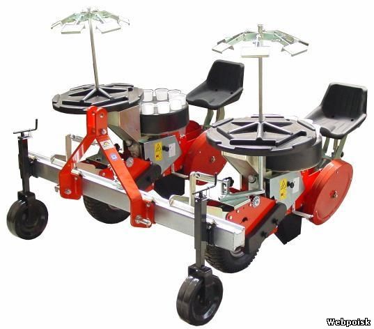 Итальянская двухрядная рассадопосадочная машина для высадки рассады из кассет с ячейками конической и пирамидальной формы диаметром 3-6 см. Высаживающие аппараты револьверного типа с 10 стаканами расположены независимо друг от друга на параллелограмной раме, что обеспечивает одинаковую глубину высадки, точное расстояние между растениями в ряду и между рядами.